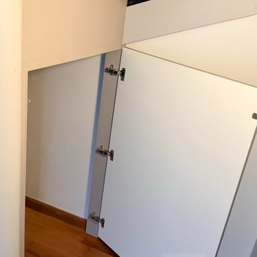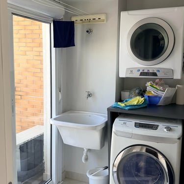 Lavanderia ampla para secagem de roupas interna e externa, equipada com máquina de lavar e armários. Rouparia e armário embaixo da escada.