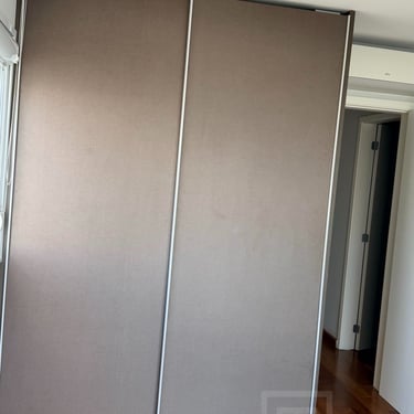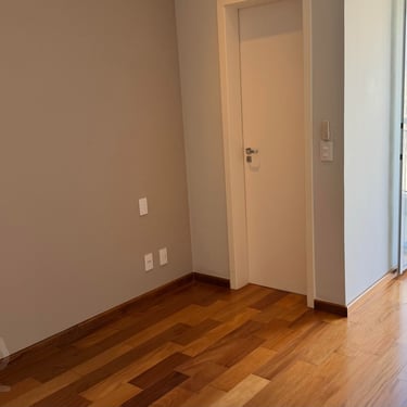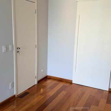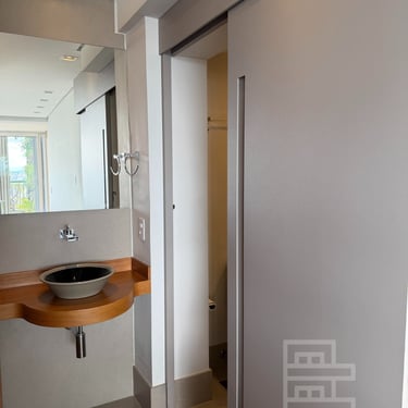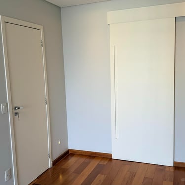 Suíte com walk-in closet e varanda ampla. Porta anti-ruído + camada de lã de rocha e drywall na parede atrás da cama para completo silêncio.