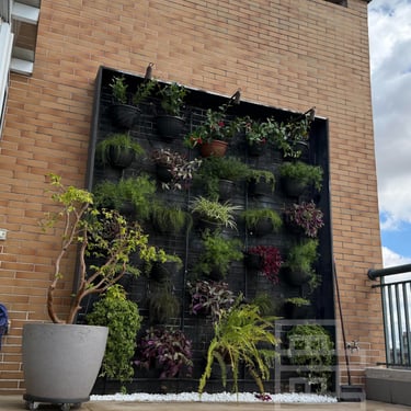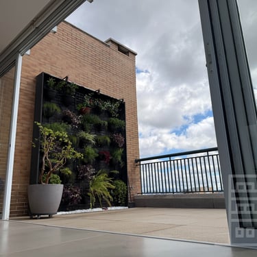 Terraço grande com jardim vertical e ponto de gás para churrasqueira.